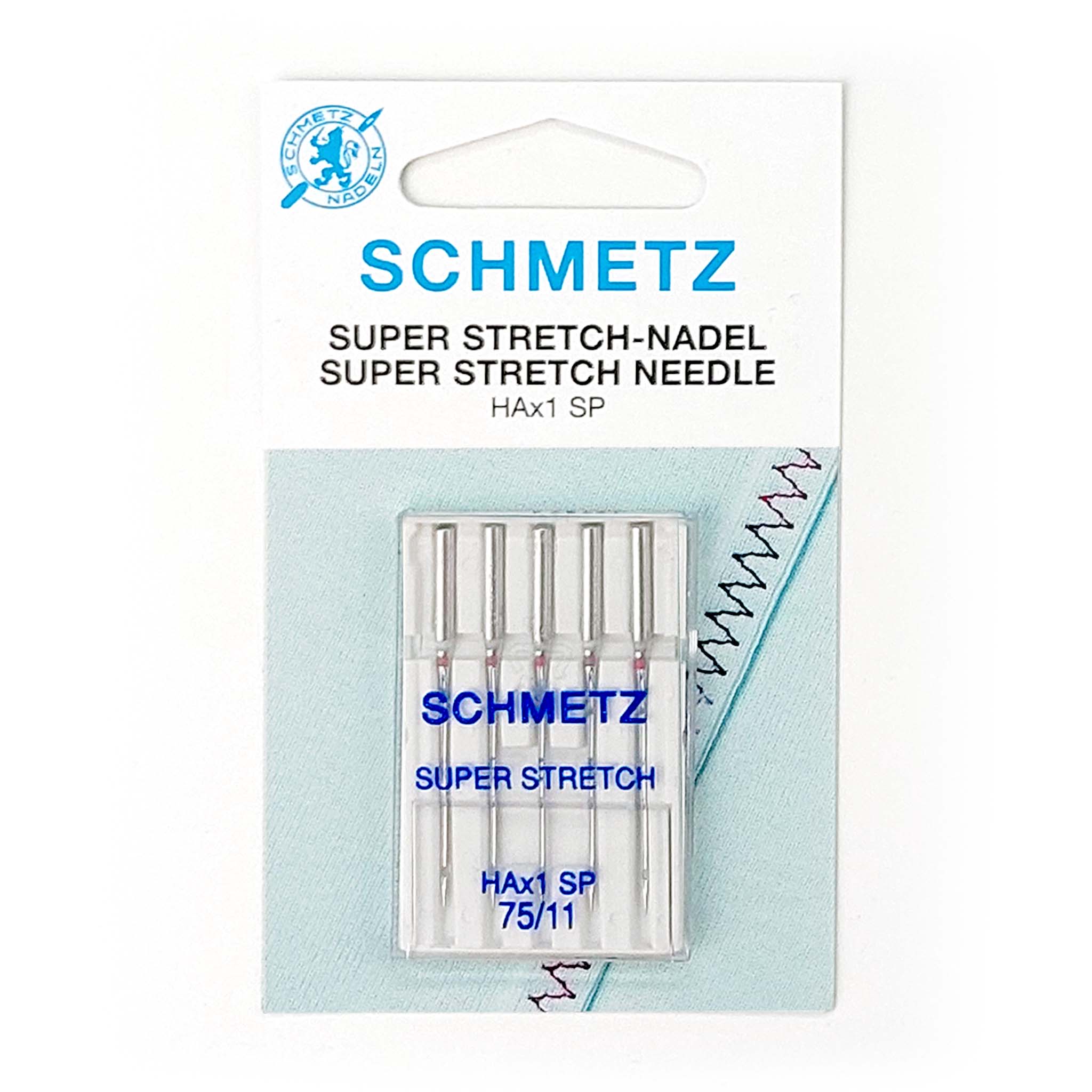 Schmetz Super Stretch ompelukoneneulat sopivat erityisesti neulotuille, joustaville kankaille, kuten elastaanitrikoot, joustocolleget ja neulokset.